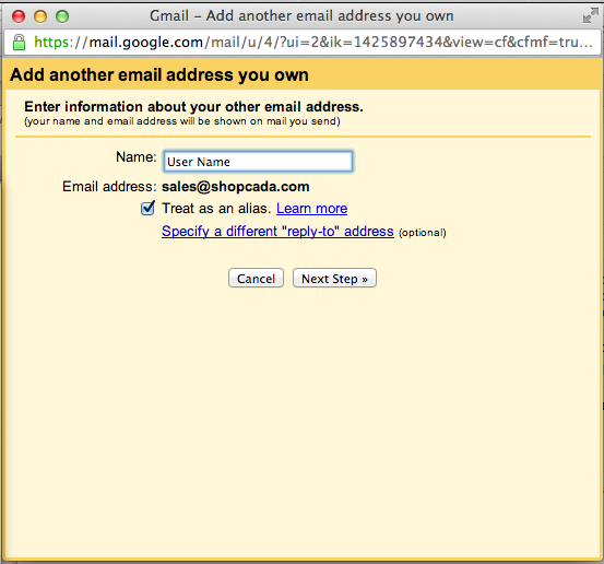 Step 6At the pop up window, enter the name that will shown on you send via emailaddress@yourdomain.com Then click NEXT STEP. |